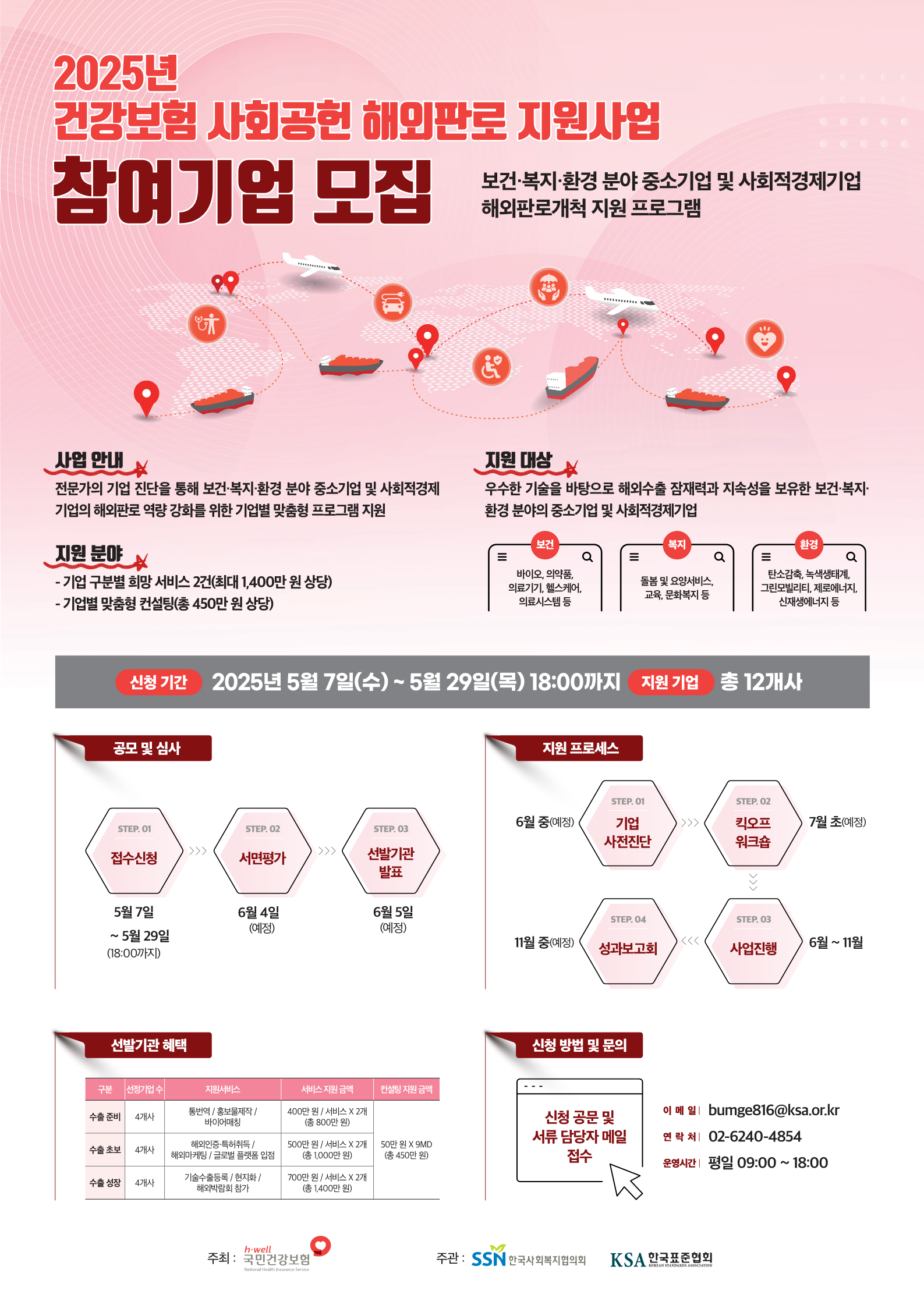 기업 간 공급 가치사슬 전체의 고객 다양화를 통한 매출 향상을 위해「2025년 건강보험 사회공헌 해외판로 개척 지원사업」의 참여기업을 모집하오니, 관심있는 기업의 많은 참여 부탁드립니다.
