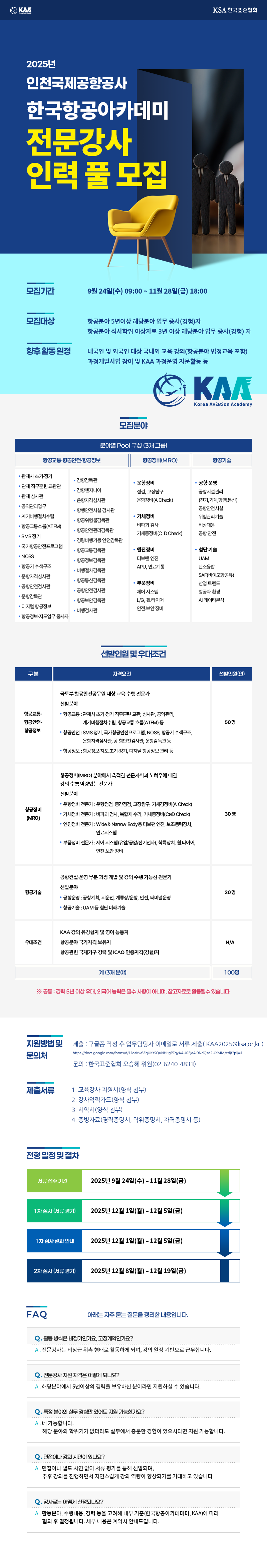 인천국제공항공사 한국항공아카데미(KAA)에서는 강의 전문 역량 강화와 강의 품질 제고를 위하여 전문강사를 모집하고 있사오니