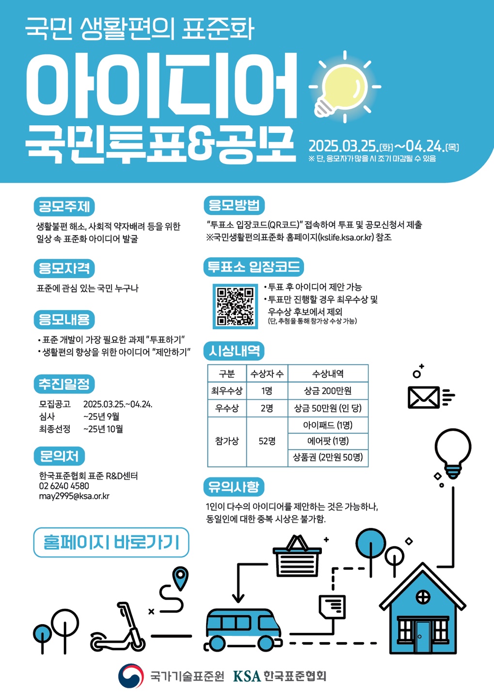 2025 제1회 국민 생활편의 표준화 아이디어 국민투표&공모를 아래와 같이 개최하오니 많은 참여 바랍니다.