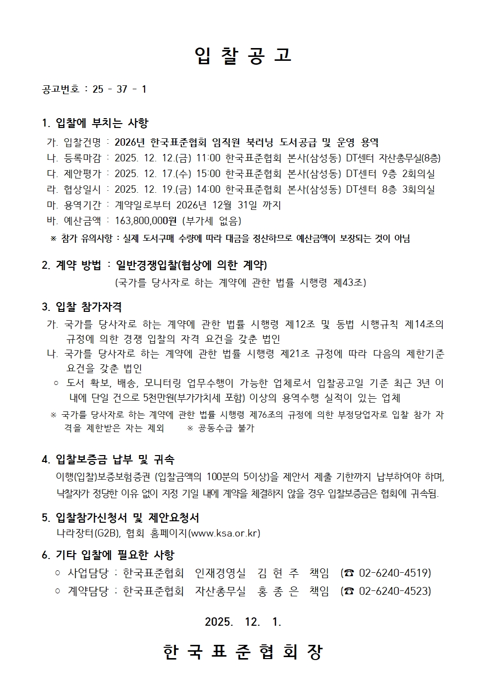 [입찰재공고]2026년 한국표준협회 임직원 북러닝 도서공급 및 운영 용역