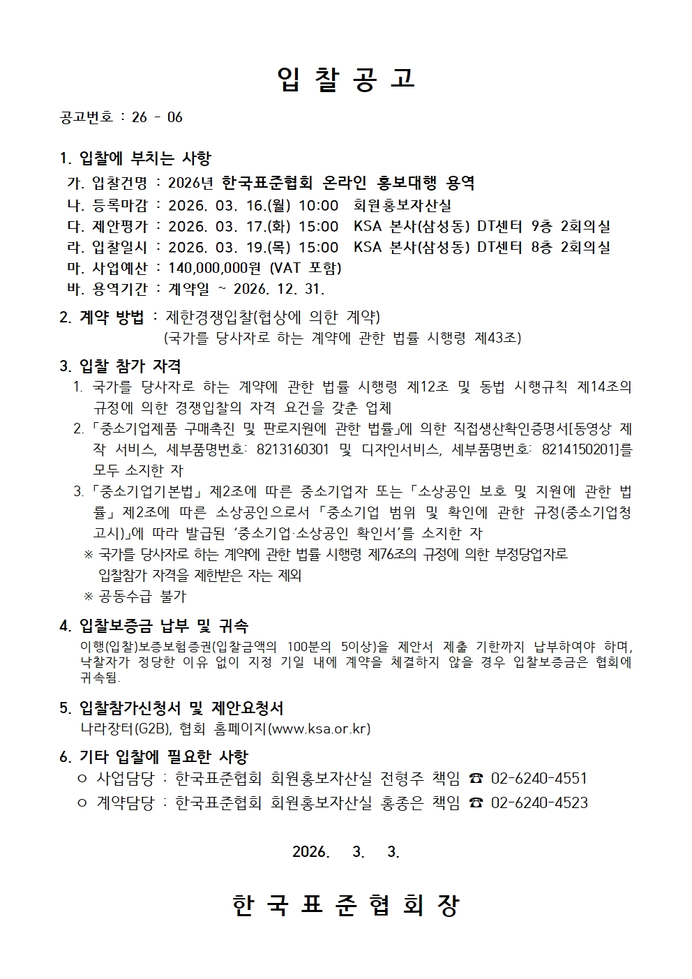 [제안요청서] 2026년 한국표준협회 SNS 콘텐츠 및 홍보 영상 제작 용역_공고용.hwp